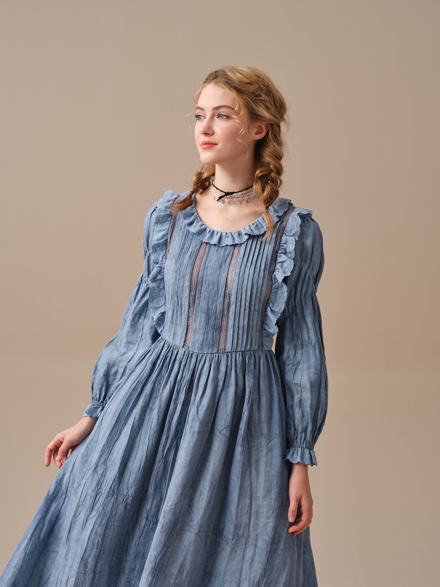 ADL.2000-39 JASMINE ROMANTIC LINEN DRESS WITH FRENCH LACE