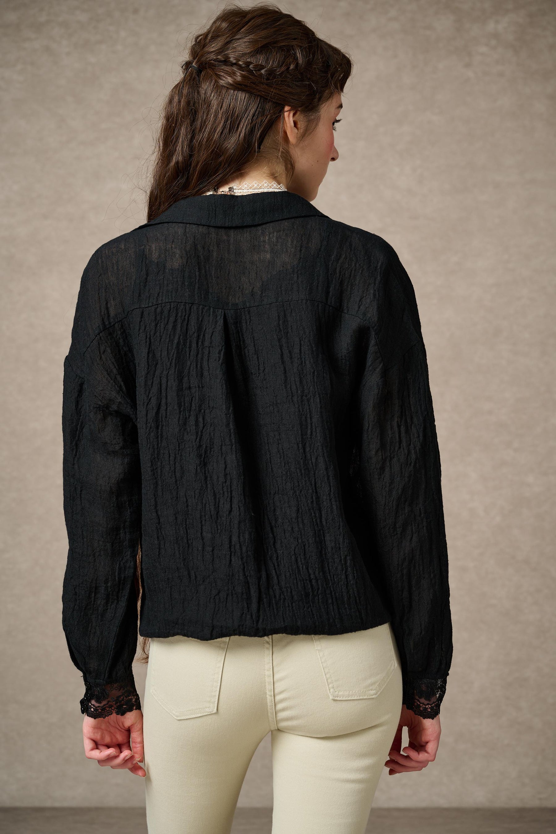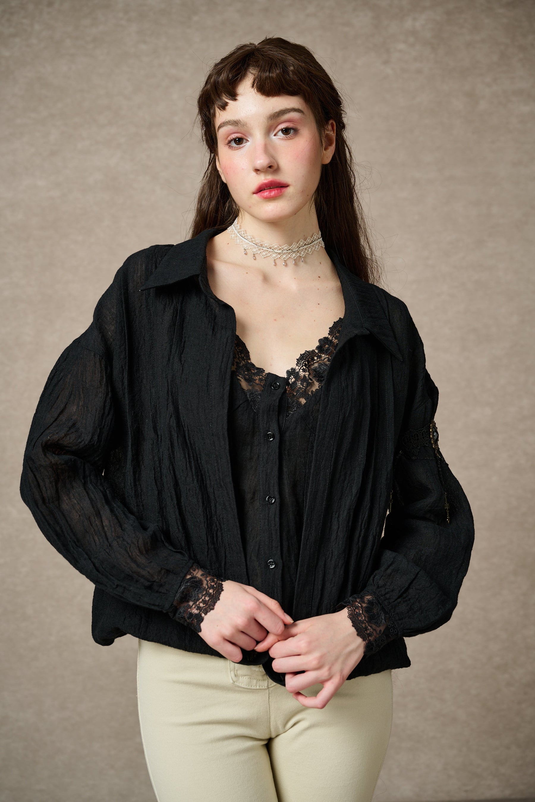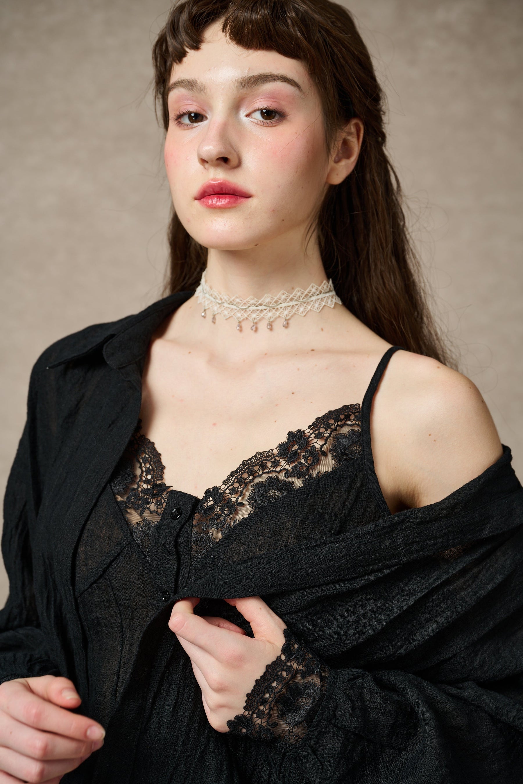 The silhouette is flattering and feminine.with a unique layered construction that gives the illusion of wearing two separate pieces when in fact it is one. The overall look is sleek and sophisticated, and undoing a few buttons reveals the delicate lace detailing that adds a touch of sweetness and romance.